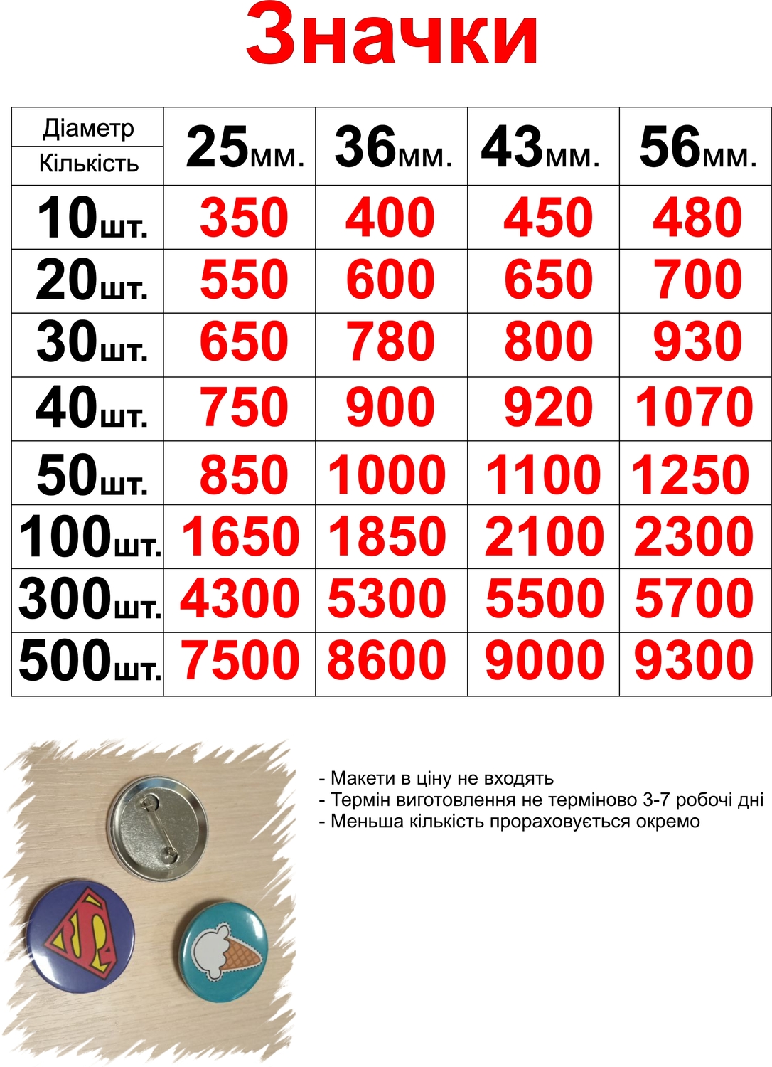 Як це працює: ви надсилаєте ідею або макет; за потреби ми допомагаємо з дизайном; після погодження друкуємо та передаємо готові значки.
